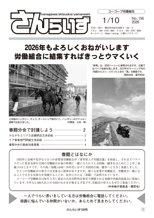 2026年1月8日 / 最終更新日時 : 2026年1月8日 uctu-admin お知らせ さんらいず156号(2026年1月号) 機関誌さんらいず156号(2026年1月号)をアップロードしました。今回の記事は、「春闘スケジュール」「春闘分会」「生活労働実感アンケート結果」「事業所閉鎖・部門閉鎖団体交渉」「宅配配送体制の逼迫」「3.1ビキニデー参加者募集」「春闘中央行動参加者募集」などです。