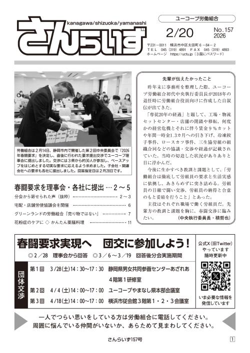 2026年2月20日 / 最終更新日時 : 2026年2月20日 uctu-admin お知らせ さんらいず157号(2026年2月号) 機関誌さんらいず157号(2026年2月号)をアップロードしました。今回の記事は、「春闘要求を提出」「分会から寄せられた声」「新春宣伝行動報告」「介護保険制度厚労省交渉」「業態別労使協議会」「新人労組説明会」「自転車の交通違反厳罰化」などです。